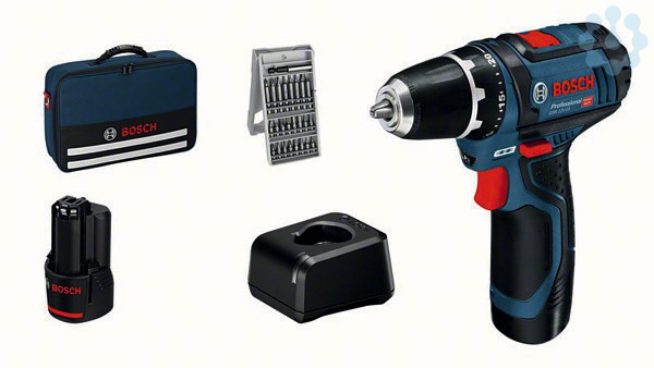 Akku-Bohrschrauber GSR 12V-15, 2 x Akku GBA 12V 2.0Ah (1 600 Z00 02X); Ladegerät GAL 12V-20 Professional; Bit-Set 25-tlg.; Bosch Professional Werkzeugtasche 12V (1 600 A00 3BG)