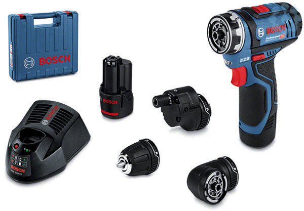Akku-Bohrschrauber GSR 12V-15 FC, L-BOXX 102 (1 600 A01 2FZ); Bohrfutteraufsatz GFA 12-B (1 600 A00 F5H); Bithalteraufsatz GFA 12-X (1 600 A00 F5J); Winkelaufsatz GFA 12-W (1 600 A00 F5K); Exzenteraufsatz GFA 12-E (1 600 A00 F5L); Schnellladegerät GAL 12V-40 Professional (1 600 A01 9R3); 2 x Akku GBA 12V 2.0Ah (1 600 Z00 02X); 1/2 L-BOXX-Einlage für Gerät und Ladegerät (1 600 A00 2UV); 1/2 L-BOXX-Einlage 12-V-Adapter (1 600 A01 1UW)