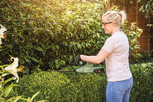 Heckenschere EasyHedgeCut 18-45. Einfaches und leichtes Schneiden mit optimaler Leistung. Leichte Akku-Heckenschere (18 V). Der 18-V-Li-Ion-Akku POWER FOR ALL bietet optimale Leistung. Bosch Anti-Blockier-System sorgt für unterbrechungsfreies Schneiden. 45 cm Messerlänge und 15 mm Zahnabstand für leichte Trimmarbeiten. Kabellose Mobilität für Bewegungsfreiheit im gesamten Garten. Im Lieferumfang enthalten: Karton