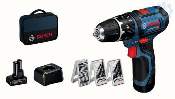 Akku-Schlagbohrschrauber GSB 12V-15, 1 x Akku GBA 12V 2.0Ah (1 600 Z00 02X); 1 x Akku GBA 12V 4.0Ah (1 600 Z00 02Y); Ladegerät GAL 12V-20 Professional; 7-tlg. Metallbohrer-Set (2/3/4/5/6/7/8 mm); 7-tlg. Holzbohrer-Set (3/4/5/6/7/8/10 mm); 25tlg. Schrauberbit-Set (2 607 017 037)