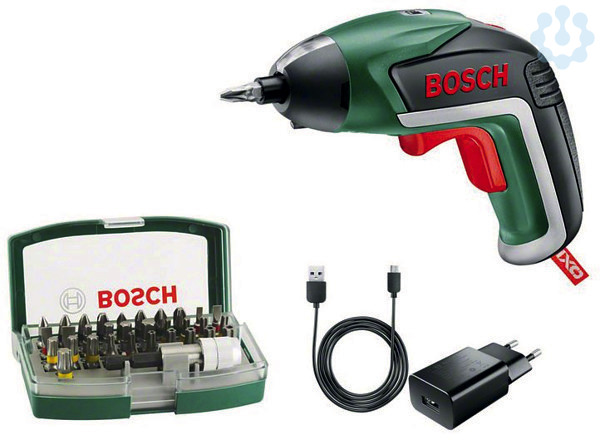 Akku-Schrauber IXO 5 Bit-Set, Der kleine Riese von Bosch, Ergonomisches Griffdesign für mehrere Griffpositionen, Power-LED mit Spot- und Streulichtmodus, Micro-USB-Ladegerät für mobile Anschlussoptionen, Einfache Möbelmontage und -demontage, schnelles Anziehen oder Lösen von Schrauben, Lithium-Ionen-Technologie ohne Memory-Effekt oder Selbstentladung des Akkus, 32-tlg. Schrauberbit-Set, Micro-USB-Lader, Kartonschachtel