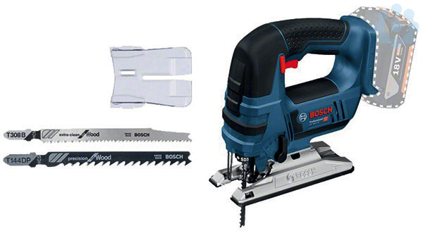 Akku-Stichsäge GST 18V-LI B, Spanreißschutz (2 601 016 096); 1 x Stichsägeblatt T 308 BP, Precision for Wood (separat erhältlich als 3er-Pack: 2 608 667 399); 1 x Stichsägeblatt T 144 DP, Precision for Wood (separat erhältlich als 3er-Pack: 2 608 633 A31); 1 x Stichsägeblatt T 244 D, Speed for Wood (separat erhältlich als 3er-Pack: 2 608 630 879); Karton