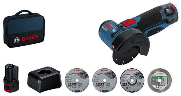 Akku-Winkelschleifer GWS 12V-76, 2 x Inox-Trennscheibe, Expert for Inox, 76 x 10 mm (separat erhältlich als 5er-Pack: 2 608 601 520); 1 x Karbidtrennscheibe, Carbide Multiwheel, 76 x 10 mm (2 608 901 196); 1 x Diamanttrennscheibe, Best for Ceramic, 76 x 10 mm (2 608 615 020); 1 x Schleifscheibe, Expert for Inox, 76 x 10 mm (separat im 2er-Set erhältlich: 2 608 601 705); Ladegerät GAL 12V-20 Professional; 2 x Akku GBA 12V 2.0Ah (1 600 Z00 02X); Schutzhaube (2 608 000 632); Werkzeugtasche