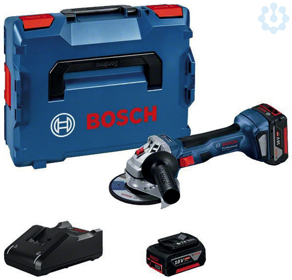 Akku-Winkelschleifer GWS 18V-7, Aufnahmeflansch (1 605 703 099); Spannmutter (1 603 340 040); Zweilochschlüssel (1 607 950 043); Schutzhaube (2 608 000 678); Zusatzhandgriff (1 602 025 024); 2 x Akku GBA 18V 4.0Ah (1 600 Z00 038); Schnellladegerät GAL 18V-40 Professional (1 600 A01 9RJ); L-BOXX 136 (1 600 A01 2G0); 1/1 L-BOXX-Einlage für Gerät und Ladegerät (1 600 A00 2WH)