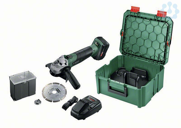Akku-Winkelschleifer (ohne Akku und Ladegerät) AdvancedGrind 18 + SystemBox. Kabellose Freiheit und optimale Handlichkeit für verschiedene DIY-Arbeiten. Leistungsstarker Motor und 18-Volt-Akku zur Bewältigung verschiedener DIY-Arbeiten. Elektronische Drehzahlvorwahl sorgt für die perfekte Drehzahl passend zu Anwendung und Material. Sanftanlauf, Bremsfunktion und schnell einstellbare Schutzhaube für reibungsloses Arbeiten. Schneller, leichter und werkzeugloser Scheibenwechsel in weniger als 12 Sekunden. Ideal zum Schleifen, Trennen, Bürsten und Polieren von Metall, Stein, Beton und Fliesen. Power for ALL: Ein Akku und ein Ladegerät für das komplette Home & Garden-Gerätesystem. Der Syneon Chip steuert den Energieverbrauch für optimale Effizienz und längere Laufzeit. Im Lieferumfang enthalten: einzelne SystemBox, Größe M (1 600 A01 SR4), kleine Zubehörbox, Größe M (1 600 A01 V7P), 1 x Akkupack PBA 18 V 4,0 Ah W-C, Ladegerät AL 1830 CV, Diamanttrennscheibe (2 607 019 475), schnellverstellbare Schutzhaube (2 605 510 289), Schnellspannmutter M14 (2 608 000 684), Handgriff (2 602 025 183)