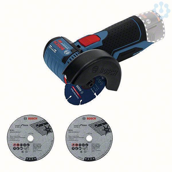 Akku-Winkelschleifer GWS 12V-76, Karton; 1/2 L-BOXX-Einlage für GWS 12V-76 (1 600 A00 F0F); 1 x Karbidtrennscheibe, Carbide Multiwheel, 76 x 10 mm (2 608 901 196); 2 x Inox-Trennscheibe, Expert for Inox, 76 x 10 mm (separat erhältlich als 5er-Pack: 2 608 601 520); Schutzhaube (2 608 000 632)