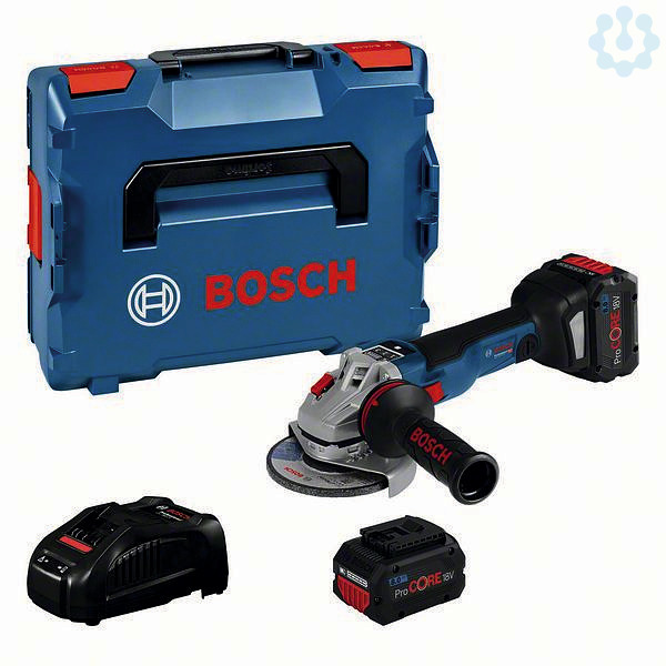 Akku-Winkelschleifer GWS 18V-10 SC, Der kleine Akku-Winkelschleifer GWS 18V-10 SC Professional bietet verbesserte Leistungsfähigkeit und Werkzeugführung in der 18-Volt-Kategorie. Er bietet dank dem leistungsstarken bürstenlosen Motor und der ProCORE18V-Akkutechnologie über den Akku dieselbe Leistung wie ein kabelgebundener Schleifer mit 1.000 Watt. Der Schleifer wird mit installiertem Drop Control, KickBack Control und Intelligent Brake System ausgeliefert, wodurch maximaler Anwenderschutz und Komfort sichergestellt sind. Sein Bluetooth Connectivity-Modul ermöglicht Anpassungen direkt über die Toolbox App, und ein User Interface mit Drehzahlvorwahl sorgt mit Aktivwerkzeug-Feedback für größtmöglichen Komfort. Das Werkzeug eignet sich zum Schneiden und Abschleifen von Metall, Stein und Beton. Das Gerät ist kompatibel mit allen Bosch Professional 18V-Akkus und -Ladegeräten (Professional 18V System). Ferner verfügt der GWS 18V-10 SC Professional auch über Drop Control, Intelligent Brake System, Schnellspannmutter und KickBack Control. Aufnahmeflansch (ET-Nr. 2 605 703 014); 1/1 L-BOXX-Einlage für Gerät und Ladegerät (1 600 A01 166); L-BOXX 136 (1 600 A01 2G0); Schutzhaube (1 605 510 365); Zusatzhandgriff Vibration Control (2 602 025 171); 1 x Bluetooth Low Energy Modul GCY 42 Professional (1 600 A01 3WF); 2 x Akku ProCORE18V 8.0Ah (1 600 A01 6GK); Schnellladegerät GAL 1880 CV (1 600 A00 B8G); Schnellspannmutter (2 608 000 684)