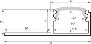 Alu-Fliesenprofil für direkte Beleuchtung Innenmaß für Strips bis 10 mm Breite für die Innenanwendung Material: Aluminium eloxiert LxBxH in mm: 2.000 x 37 x 11 Lieferheinweis: Lieferung ohne Zubehör - bitte separat bestellen