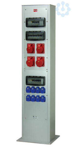 Alusäule 1330x300x175 IP54 mit 1xKunstst.-Wandverteiler Modell STROBL7 IP54 1xKunstst.-Wandverteiler Modell ANIF7 IP54 1xM40 Verschraubung unten (Kabeldurchm. 22-32mm PG36) grau 2xCEE-Steckdose 32A 5p 400V abgesichert ü. 2xLS 32A 3p C 2xCEE-Steckdose 16A 5p 400V abgesichert ü. 2xLS 16A 3p C 8xSK-Steckdose 16A 250V IP54 abgesichert ü. 4xLS 16A 1p C 1xFI 63A/4/0.03A (TYP A 63AT) über alle CEE Ausgänge 1xFI 63A/4/0.03A (TYP A 40AT) über alle SSD Ausgänge Leitungsschutzschalter und FI-Schutzschalter Marke PCE VDE Verteiler auf HKL-Klemme (max.5x25qmm/5x16qmmYF!) verdrahtet