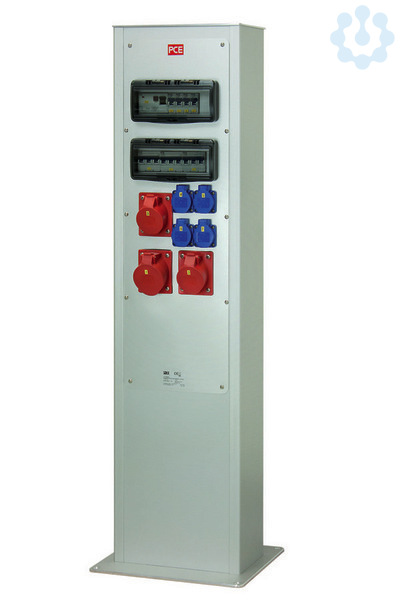 Alusäule 1210x300x175 IP54 mit Kunstst.-Wandverteiler Modell STROBL7 IP54 1xM40 Verschraubung unten (Kabeldurchm. 22-32mm PG36) grau 1xCEE-Steckdose 32A 5p 400V abgesichert ü. 1xLS 32A 3p C 2xCEE-Steckdose 16A 5p 400V abgesichert ü. 2xLS 16A 3p C 4xSK-Steckdose 16A 250V IP54 abgesichert ü. 4xLS 16A 1p C 1xFI 63A/4/0.03A (TYP A 63AT) über alle Ausgänge Leitungsschutzschalter und FI-Schutzschalter Marke PCE VDE Verteiler auf HKL-Klemme (max.5x25qmm/5x16qmmYF!) verdrahtet