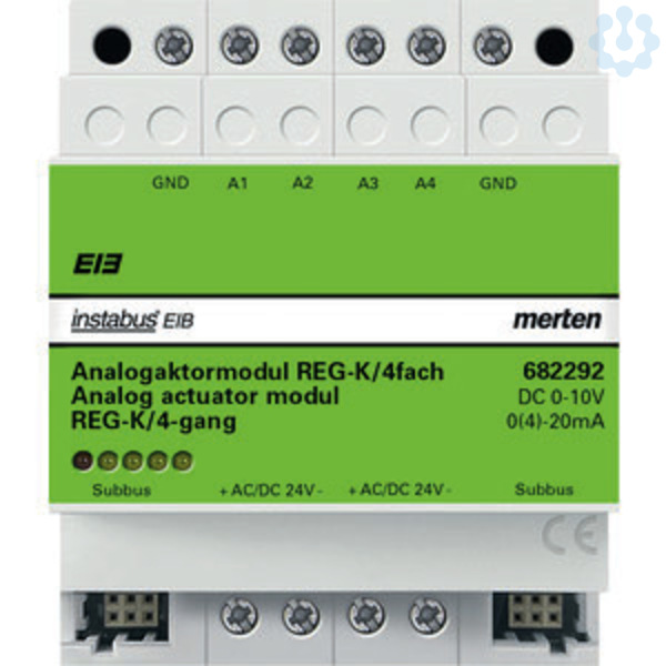 Erweiterungsmodul für Analogaktor REG-K/4fach von 4 auf 8 Analogausgänge. Der Anschluss erfolgt über den Subbus. Zur Ansteuerung unterschiedlicher Stellgrößen (z. B. Stellmotoren) besteht die Möglichkeit die Ausgangskanäle voneinander unabhängig auf unterschiedliche Strom- und Spannungssignale zu parametrieren. Für die Montage auf Hutschienen TH35 nach EN 60715. Hilfsspannung: AC 24 V (+/-10%). Analogausgänge: 4. Stromsignale: 0-20 mA, 4-20 mA. Spannungssignale: 0-1 V, 0xx 10 V (DC). Drahtbruchüberwachung: 4-20 mA. Ausgänge: DC 24 V, 100 mA (Summe). Gerätebreite: 4 TE entspricht ca. 72 mm. Im KNX zu komplettieren mit: Analogaktor REG-K/4fach 682291. Lieferumfang: Mit Subbus-Jumper. Farbe: lichtgrau.