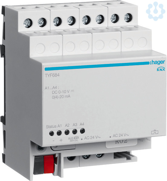 Analogaktor 4fach REG KNX. Analogaktor empfängt KNX Telegramme und wandelt diese, z.B. für die Heizungs-, Klima- und Lüftungstechnik in Strom- und/oder Spannungssignale um. Der Aktor besitzt 4 unabhängigen Analogausgängen. Art des Signalausgangs (0 bis 10 V, 0 bis 1 V, 0 bis 20 mA, 4 bis 20 mA) zusätzlich ist der Ausgangsstatus über Status- und/oder Schaltobjekt auswertbar. Der Aktor ist erweiterbar mit Erweiterungsanalogmodul TYF684E mit weiteren 4 analogen Ausgängen. Die Spannungsausgänge werden auf Kurzschluss überwacht. Der Aktor hat eine Systemschnittstelle zum Anschluss der Erweiterungsmodule. Das Gerät verfügt über eine Programmiertaste mit roter LED. Über eine grün/roter LED (Betrieb/Fehler) werden die beiden Status angezeigt. Busanschluss über Anschlussklemme. Anschluss der Ausgänge mit Schraubklemmen. Der Aktor benötigt für den Betrieb eine Spannungsversorgung 24 V AC. Jeder Kanal kann separat programmierbar werden. Nicht benötigte Ausgänge lassen sich abschalten. Das Format des Eingangswertes beträgt 8 Bit oder 16 Bit. Beim Dimmaktorbetrieb 8-Bit bei den Eingangsobjekten. Es können zwei Zwangsführungen ausgeführt werden. Die Eingangsgrößen werden zyklisch Überwacht. Die Reaktion bei Überschreiten der Überwachungszeit ist einstellbar. Verhalten bei Busspannungsausfall ist einstellbar, sowie das Verhalten bei Busspannungswiederkehr.
