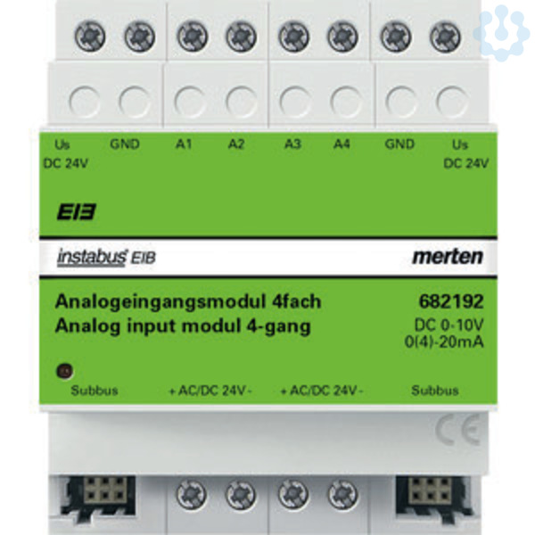 Erweiterungsmodul für Wetterstation REG-K/4fach und Analogeingang REG-K/4fach von 4 auf 8 Analogeingänge. Der Anschluss erfolgt über den Subbus. Es können bis zu vier frei kombinierbare analoge Sensoren angeschlossen werden. Die Auswertung sowie die Grenzwertverarbeitung erfolgen im Analogeingang oder Wetterstation. Mit Drahtbruchüberwachung der 4-20 mA-Eingängexx Für die Montage auf Hutschienen TH35 nach EN 60715. Hilfsspannung: AC 24 V (+/-10%). Leistung: max. 4 VA. Analogeingänge: 4. Stromschnittstelle: 0-20 mA, 4-20 mA. Spannungsschnittstelle: 0-1 V, 0-10 V (DC). A/D-Wandlung: 14 Bit. Ausgänge: DC 24 V, 100 mA. Drahtbruchüberwachung: 4-20 mA. Gerätebreite: 4 TE entspricht ca. 72 mm. Im KNX zu komplettieren mit: Wetterstation REG-K/4fach 682991. Analogeingang REG-K/4fach 682191. Spannungsversorgung REG, AC 24 V/1 A 663529. Zubehör: Windsensor mit 0-10 V Schnittstelle 663591. Windsensor mit 0-10 V Schnittstelle und Heizung 663592. Regensensor 663595. Helligkeitssensor 663593. Dämmerungssensor 663594. Temperatursensor 663596. Lieferumfang: Mit Subbus-Jumper. Farbe: lichtgrau.