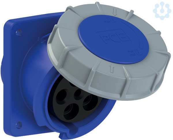 CEE-Anbausteckdose schräg (100x112) 63A 5p 9h IP67 POWER TWIST; Gehäusematerial: PA6; Nennstrom: 63A; Polzahl: 5 (3P+N+PE); Uhrzeit-Stellung: 9h; Nennspannung/Frequenz: 120/208V~ - 144/250V~ / 50+60Hz; Kontakte: Messing, mit Lamellenkontakt (CuBe); Anschlusstechnik: Rahmenklemmen mit Schrauben; Abmessungen (Flansch/Bohrung): 100x112 mm / 80x88 mm; Schutzart: IP66/IP67