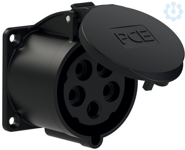 CEE-Anbausteckdose gerade (70x70mm) 32A 5p 6h IP44/IP54 schwarz; Gehäusematerial: PA6; Nennstrom: 32A; Polzahl: 5 (3P+N+PE); Uhrzeit-Stellung: 6h; Nennspannung/Frequenz: 200/346V~ - 240/415V~ / 50+60Hz; Kontakte: Messing; Anschlusstechnik: Schraubklemmen; Abmessungen (Flansch/Bohrung): 70x70 mm / 56x56 mm; Schutzart: IP44/IP54