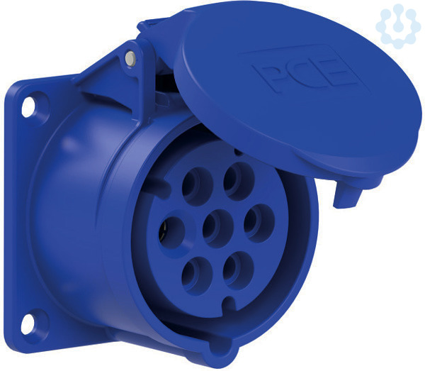 CEE-Anbausteckdose (70x70mm) 16A 7p 9h IP44/IP54; Gehäusematerial: PA6; Nennstrom: 16A; Polzahl: 7 (6P+PE); Uhrzeit-Stellung: 9h; Nennspannung/Frequenz: 220-250V~ / 50+60Hz; Kontakte: Messing vernickelt; Anschlusstechnik: Schraubklemmen; Abmessungen (Flansch/Bohrung): 70x70 mm / 56x56 mm; Schutzart: IP44/IP54