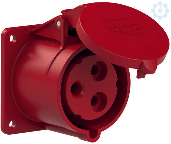 CEE-Anbausteckdose gerade (75x75mm) 32A 3p 9h IP44/IP54; Gehäusematerial: PA6; Nennstrom: 32A; Polzahl: 3 (2P+PE); Uhrzeit-Stellung: 9h; Nennspannung/Frequenz: 380-415V~ / 50+60Hz; Kontakte: Messing; Anschlusstechnik: Schraubklemmen; Abmessungen (Flansch/Bohrung): 75x75 mm / 60x60 mm; Schutzart: IP44/IP54