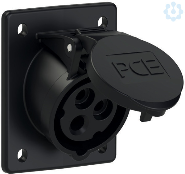CEE-Anbausteckdose schräg (70x85mm) 16A 3p 7h IP44/IP54; Gehäusematerial: PA6; Nennstrom: 16A; Polzahl: 3 (2P+PE); Uhrzeit-Stellung: 7h; Nennspannung/Frequenz: 480-500V~ / 50+60Hz; Kontakte: Messing; Anschlusstechnik: Schraubklemmen; Abmessungen (Flansch/Bohrung): 70x85 mm / 50x65 mm; Schutzart: IP44/IP54