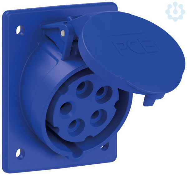 CEE-Anbausteckdose schräg (80x97mm) 16A 5p 9h IP44/IP54; Gehäusematerial: PA6; Nennstrom: 16A; Polzahl: 5 (3P+N+PE); Uhrzeit-Stellung: 9h; Nennspannung/Frequenz: 120/208V~ - 144/250V~ / 50+60Hz; Kontakte: Messing; Anschlusstechnik: Schraubklemmen; Abmessungen (Flansch/Bohrung): 80x97 mm / 60x73 mm; Schutzart: IP44/IP54