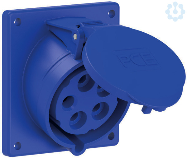 CEE-Anbausteckdose schräg (92x100mm) 32A 5p 9h IP44/IP54; Gehäusematerial: PA6; Nennstrom: 32A; Polzahl: 5 (3P+N+PE); Uhrzeit-Stellung: 9h; Nennspannung/Frequenz: 120/208V~ - 144/250V~ / 50+60Hz; Kontakte: Messing; Anschlusstechnik: Schraubklemmen; Abmessungen (Flansch/Bohrung): 92x100 mm / 77x85 mm; Schutzart: IP44/IP54