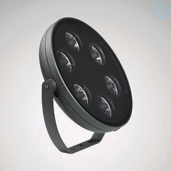 Runder, kompakter LED-Scheinwerfer. Die Leuchte ist Teil einer Baureihe mit Varianten, die unterschiedliche beleuchtungstechnische Anforderungen bei gleichem Leuchtendesign abdecken. Zur direkten Montage auf festem Untergrund. Mit Erdspieß (Zubehör) für Befestigung im Erdreich geeignet. Mit sechs kreisförmig angeordneten, runden Reflektoren aus faccetiertem Aluminium, hochglänzend. Mit rotationssymmetrisch breit strahlender Lichtstärkeverteilung. Bemessungslichtstrom 7600 lm, Bemessungsleistung 80,00 W, Leuchten-Lichtausbeute 95 lm/W. Lichtfarbe neutralweiß, ähnlichste Farbtemperatur (CCT) 4000 K, allgemeiner Farbwiedergabeindex (CRI) Ra > 80. Farborttoleranz (initial MacAdam) ≤ 3 SDCM. Mittlere Bemessungslebensdauer L80(tq 25 °C) = 50.000 h. Die Lichtquelle ist entsprechend der Ökodesign-Anforderungen (VO (EU) 2019/2020) austauschbar. Runder, flacher Leuchtenkörper aus korrosionsbeständigem Aluminium-Druckguss. Oberfläche anodisiert und anschließend mit einer Epoxy-Pulvergrundierung und alterungsbeständigen Polyester-Pulverbeschichtung versehen. Befestigungsbügel aus verzinktem Stahl. Farbe Leuchtenkörper anthrazit (DB 703). Der Leuchtenkörper kann auf Anfrage ohne Mehrkosten in nachfolgenden Farben ausgeführt werden: Schwarz texturisiert (Akzo Nobel 8118669, ähnlich RAL 9005), Weiß texturisiert (Akzo Nobel 8158870, ähnlich RAL 9016), Grau texturisiert (Akzo Nobel 8129595, ähnlich RAL 9006). Weitere Farbvarianten nach RAL oder DB Farbcode sind auf Anfrage gegen Mehrpreis möglich. Länge 102 mm, Leuchtenhöhe 365 mm, Breite 368 mm. Leuchtenkopf Ø 330 mm. Mit planer Abschlussscheibe, extraklar. Zentrales Gelenk zur Drehung und Schwenkung auf zwei Achsen mit Arretierungssystem für die präzise Strahlerausrichtung. Horizontaler Drehbereich: 330°, Schwenkbereich - 45° - 90°. Mit Gehäuseschrauben aus Edelstahl. Schutzklasse (EN 61140): I, Schutzart (DIN EN 60529): IP65, Stoßfestigkeitsgrad nach IEC 62262: IK10. Gewicht: 5,3 kg. Mit 5-poliger Anschlussleitung 5 x 0,75 mm2, 1500 mm. Mit elektronischem Betriebsgerät, digital dimmbar (DALI). Stoßspannungsfestigkeit Differential Mode / Common Mode: 1 kV / 2 kV. Das Produkt erfüllt die grundlegenden Anforderungen der anwendbaren EU-Richtlinien und des Produktsicherheitsgesetzes und trägt die CE-Kennzeichnung.
