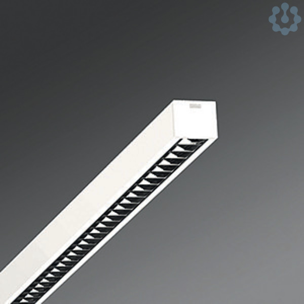 Stahlblechgehäuse im Quadratdesign, vorbereitet zum Befestigen von Stirnseiten oder Leuchtenverbindern aus Stahl, Lichtverteilung direkt strahlend mittels reflexionsverstärktem Aluminium-Parabolraster mit Reinstsilber-Beschichtung, hochglänzend in Darklight-Spiegeloptik mit Niederquerschnitts-Lamellen, Lichtreflexionsgrad 97 %, für Bildschirmarbeitsplätze, 65° < 1000 cd/qm rundumentblendet nach aktueller Norm DIN-EN 12464-1, selbstrastend, bei Lichtbandmontage Raster optisch durchlaufend, Elektrischer Anschluss über 3-polige Anschlussklemme in Steckkontakt-Technik.