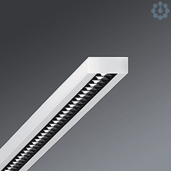 Stahlblechgehäuse, kompakter rechteckiger Querschnitt, Bauhöhe 40mm, vorbereitet zum Befestigen von Stirnseiten oder Leuchtenverbindern aus Stahl, Lichtverteilung direkt strahlend mittels reflexionsverstärktem Aluminium-Parabolraster mit Reinstsilber-Beschichtung, hochglänzend in Darklight-Spiegeloptik mit Niederquerschnitts-Lamellen, Lichtreflexionsgrad 98 %, für Bildschirmarbeitsplätze, 65° < 1000 cd/qm rundumentblendet nach aktueller Norm DIN-EN 12464-1, selbstrastend, bei Lichtbandmontage Raster optisch durchlaufend, Elektrischer Anschluss über 3-polige Anschlussklemme in Steckkontakt-Technik.