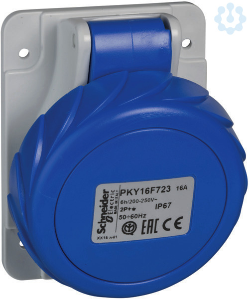 Anbausteckdose PratiKa gerade. Es verfügt über 2P+E-Pole, ein Nennstrom von 16 A und eine Betriebsspannung von 230 VAC. Die Abmessungen der Grundplatte sind (B) 73 mm x (H) 85 mm. Die Schutzart ist IP65 und IK09. Die Feuerbeständigkeit beträgt 850 °C. Die Kabeleinführungen sind für flexible oder starre Kabel vorgesehen. Der Querschnitt der Kabel in 16 A beträgt 1 mm² bis 4 mm². Die Farbe des Sockels ist hellgrau (RAL 7035) und lässt die Betriebsspannung leicht blau erkennen. Die Frequenz beträgt 50 Hz oder 60 Hz. Die Taktposition des Kontakts beträgt 6 h.