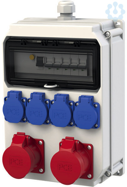 Kunstst.-Wandverteiler Modell ANIF4 IP54 320x222x114 10TE; 1xM25 Verschraubung oben (Kabeldurchm. 13-18mm PG21) grau; 2xCEE-Steckdose 16A 5p 400V abgesichert ü. 1xLS 16A 3p C; 4xSK-Steckdose 16A 250V IP54 abgesichert ü. 2xLS 16A 1p C; 1xFI 63A/4/0.03A (TYP A 40AT) über alle Ausgänge; Leitungsschutzschalter und FI Fabrikat Eaton ÖVE / VDE; Verteiler auf Vario-Connector 5polig 10qmm verdrahtet;