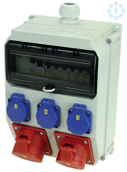 Kunstst.-Wandverteiler Modell ANIF7 IP54 320x222x140 10TE; 1xM32 Verschraubung oben (Kabeldurchm. 18-25mm PG29) grau; 1xBlindverschraubung M32 unten; 1xCEE-Steckdose 32A 5p 400V abgesichert d. Vorsicherung Zuleitung; 1xCEE-Steckdose 16A 5p 400V abgesichert ü. 1xLS 16A 3p C; 3xSK-Steckdose 16A 250V IP54 abgesichert ü. 3xLS 16A 1p C; 1xFI 63A/4/0.03A (TYP A 40AT) über alle Ausgänge; Leitungsschutzschalter und FI Fabrikat Eaton ÖVE / VDE; Verteiler auf HKL-Klemme (max.5x25qmm/5x16qmmYF!) verdrahtet