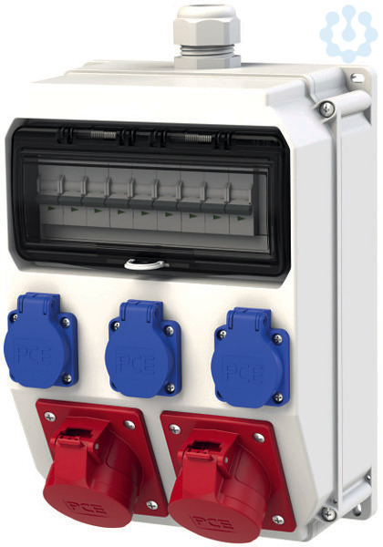 Kunstst.-Wandverteiler Modell ANIF7 IP54 320x222x140 10TE; 1xM25 Verschraubung oben (Kabeldurchm. 13-18mm PG21) grau; 1xBlindverschraubung M25 unten; 2xCEE-Steckdose 16A 5p 400V abgesichert ü. 2xLS 16A 3p C; 3xSK-Steckdose 16A 250V IP54 abgesichert ü. 3xLS 16A 1p C; Leitungsschutzschalter Fabrikat Eaton ÖVE / VDE; Verteiler auf HKL-Klemme (max.5x25qmm/5x16qmmYF!) verdrahtet; Etikett: "Zusatzschutz durch FI-Schutzschalter versorgungsseitig erforderlich!"