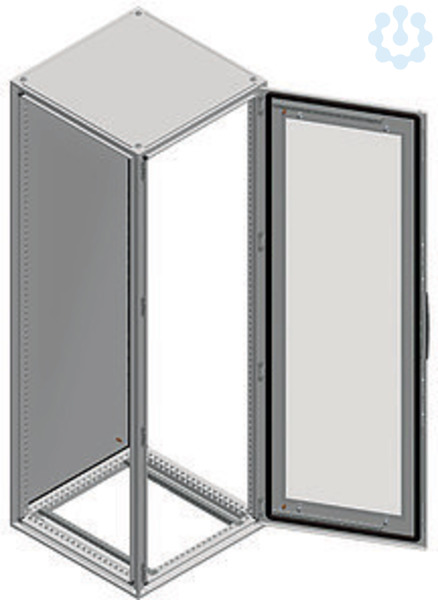 Spacial SF geeignetes Stahlgehäuse mit Sichttür an der Vorderseite. Montiert. Verschraubte Rückwand. Ohne Montageplatte. 4-Punkt-Verschlusssystem mit Griff und 5 mm Doppelbartschliessung. Verzinkter Stahl für Rahmen und Stützen. Schutzart IP 55, IK08, Farbe RAL 7035. Inklusive 4 Halterungen für die Montageplatte.