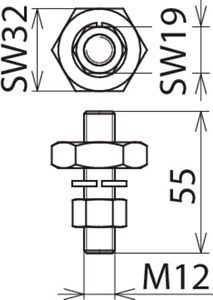 Anschlussstück zum Anschrauben, mit Gewindebolzen und loser Sechskantmutter als erdseitige Anschließstelle nach DIN VDE 0683-100 (EN/IEC 61230) an der Erdungsanlage.