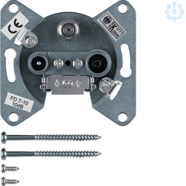 Antennen-Steckdose 3Loch Durchgangsdose Modul-Einsätze 75 Ohm Breitbandtechnologie 40 - 2400 MHz Anschlussdämpfung bei 1,5-26,1 MHz 11 dB Anschlussdämpfung bei 47-68 | 87,5-108 MHz 10,5 dB Anschlussdämpfung bei 111-174 MHz 10 dB Anschlussdämpfung bei 174-862 | 950-2050 MHz 10,5 dB Durchgangsdämpfung bei 1,5-26,1 | 47-68 | 87,5-108 1,5 dB Durchgangsdämpfung bei 111-174 MHz 1 dB Durchgangsdämpfung bei 174-862 MHz 2 dB Durchgangsdämpfung bei 950-2050 MHz 3 dB IEC 169-2 und EN 50083-1, -2, -4 EN 60728-4, -11 Schirmungsmaß nach EMV-Schutzklasse A - für SAT-Hausverteilungen ohne Speisespannung z.B. Einkabellösung - für Gemeinschafts-, DVB-T und Breitbandkabelanlagen - für terrestrischen Empfang - für analoge und digitale Übertragung - in Baumstruktur und Stammleitungen - HDTV geeignet - sperrt Gleichspannung - mit Entkopplungsmittel - mit Schraubklemmen