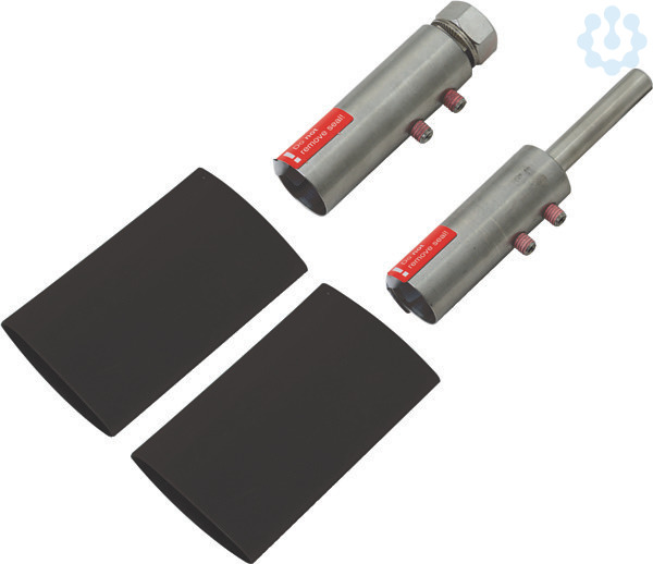 Anschlusselemente zum Abschließen der HVI long Leitung an beiden Enden, beim Erstellen des Endverschlusses der Leitung außen am Stützrohr (Kopfstück für Anschlussplatte) und Anschlusselement zum Anschließen an andere Teile des äußeren Blitzschutzes oder der Erdungsanlage (inkl. zwei Schrumpfschläuche).