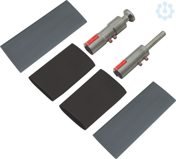 Anschlusselemente zum Abschließen der HVI long Leitung an beiden Enden, beim Erstellen des Endverschlusses der Leitung im Stützrohr (Kopfstück) und Anschlusselement zum Anschließen an andere Teile des äußeren Blitzschutzes oder der Erdungsanlage (inkl. vier Schrumpfschläuche).