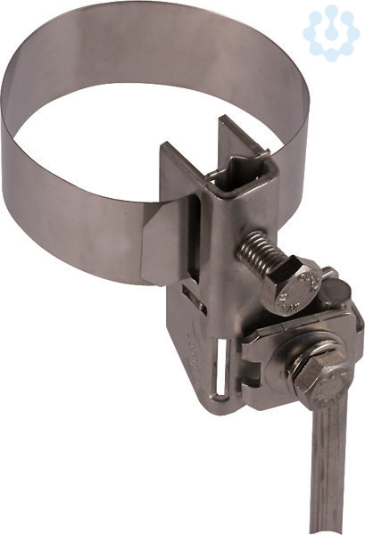 Antennen-Bandrohrschelle nach DIN EN 62561-1, zum Einbinden von Rohren in den Schutz und Funktionspotentialausgleich nach DIN VDE 0100-410/540 und den Blitzschutz-Potentialausgleich nach DIN EN 62305-3 (VDE 0185-305-3). Ausführung komplett mit stetig verstellbarem Spannband aus NIRO, zum Anschluss von 1 Leiter Rd D10 mm oder 1-2 Leiter Rd D6-8 mm oder 4-50 mm² (ein- / mehrdrähtig).