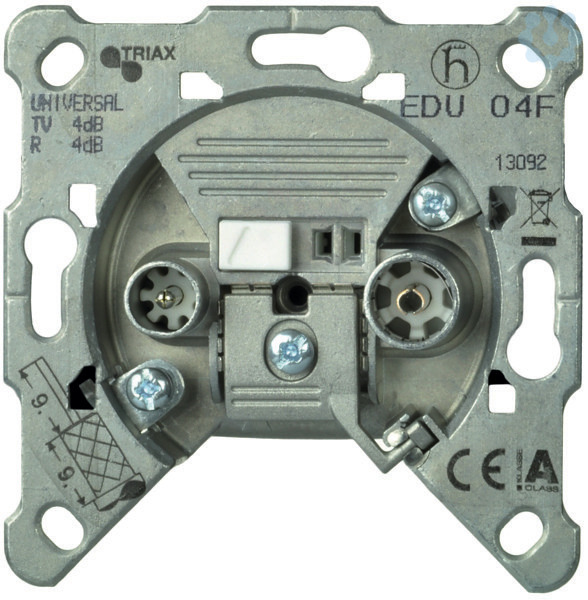 Stichleitungsdose (Einzeldose) diese Dose ist fernspeisetauglich, max. 24V- / 500mA, mit geringer Anschlussdämpfung (durchschnittlich 5 dB) (entspricht EDU 04F) Einsätze bis 2400 MHz Einsätze der Fa. Hirschmann (Bezeichnung jeweils in Klammern) Mit Buchse (RF) und Stecker (TV bzw. SAT), ohne F-Buchse. Zum Anschluss eines Tonrundfunkempfängers und eines Fernsehrundfunkempfängers oder Satelliten-Receivers. Zukunftssichere Super-Breitband-Technologie bis 2400 MHz Für Koaxialkabel mit Außenleiter bis o 5,5mm. Die Antennendosen sind geeignet für den Anschluss - einer SAT-Empfangsanlage, oder - einer terrestrischen Empfangsanlage, oder - eines BK-Anschlusses Die Antennendosen sind rückkanaltauglich für einen Frequenzbereich von 4MHz bis 30MHz. Buchse und Stecker sind nach IEC 169-2 gefertigt und erfüllen die Vorschrift DIN VDE 0855, Teil 10 und Teil 12. Die Antennendosen sind DBP-zugelassen. Durch den weit öffnenden Tragring wird das einfache, knickfreie Einlegen des Koaxialkabels ermöglicht. Grundsätzlich sollen - Stichleitungsdosen nur für eine Sternverkabelung - am Ende einer Stammleitung wiederum eine Stammleitungsdose mit Abschlusswiderstand eingesetzt werden.