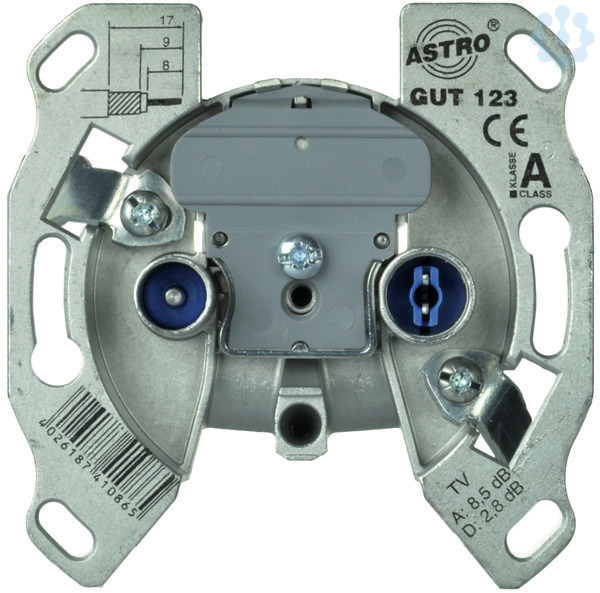 Stammleitungsdose (Durchgangsdose) mit geringer Anschlussdämpfung (durchschnittlich 8 dB). (entspricht GUT 123) Einsätze bis 862 MHz Einsätze der Fa. ASTRO (Bezeichnung jeweils in Klammern) mit Buchse (RF) und Stecker (TV) zum Anschluss eines Tonrundfunkempfängers und eines Fernsehrundfunkempfängers. Für Koaxialkabel mit Außenleiter bis o 5,5mm Die Antennendosen sind geeignet für den Anschluss an - eine terrestrische Empfangsanlage. oder - einen BK-Anschluss Die Antennendosen sind rückkanaltauglich für einen Frequenzbereich von 4 MHz bis 20 MHz. Die Antennendosen sind DBP-zugelassen nach 1 R8- 15. Grundsätzlich sollen - Stichleitungsdosen nur für eine Sternverkabelung - am Ende einer Stammleitung wiederum eine Stammleitungsdose mit Abschlusswiderstand eingesetzt werden. Schirmungsmaß > 85 dB. entspricht der Klasse A.