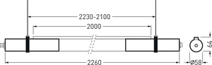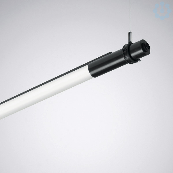LED-Rohrleuchte aus satiniertem PMMA für die abgehängte Montage. Zur abgehängten Montage in Innenräumen. Befestigungsschellen sowie 1-Punkt-Seilpendelsatz sind im Lieferumfang enthalten. Für Abhängelängen bis 3000 mm. Mit rohrförmiger Abdeckwanne aus PMMA, satiniert. Mit lambertscher Lichtstärkeverteilung. Mit vorwiegend direkt strahlender Lichtstärkeverteilung. Mit leichtem Indirektanteil zur dekorativen Oberflächenaufhellung. Aufteilung der Gesamt-Lichtstärkeverteilung (direkt/indirekt): 88/12 %. Bemessungslichtstrom 7400 lm, Bemessungsleistung 56,00 W Leuchten-Lichtausbeute 132 lm/W. Farborttoleranz (initial MacAdam) ≤ 3 SDCM, allgemeiner Farbwiedergabeindex (CRI) Ra > 80, Mittlere Bemessungslebensdauer L80(tq 25 °C) = 60.000 h. Leuchtenkörper aus satiniertem PMMA mit schwarz lackiertem Aluminiumkanal. Kopfstücke aus Aluminium, schwarz pulverbeschichtet (RAL 9005). Leuchtenlänge 2260 mm, Leuchtendurchmesser Ø 58 mm. Zulässige Umgebungstemperatur (ta): -20 °C - +25 °C. Schutzklasse (EN 61140): I, Schutzart (DIN EN 60529): IP20, Stoßfestigkeitsgrad nach IEC 62262: IK04, Prüftemperatur Glühdrahttest gemäß IEC 60695-2-11: 650 °C. Anschlussvorrichtungen an beiden Stirnseiten als Buchse oder Stecker ausgeführt (Typ WIELAND RST 20i5). Anschlussleitung und Verbindungsleitungen als separat zu bestellende Zubehöre erhältlich. Durchgangsverdrahtung zur Realisierung von Mehrfachanwendungen und Lichtbändern in der Leuchte enthalten. Betriebsgerät gemäß DALI-2-Standard (EN 62386). Mit elektronischem Betriebsgerät, digital dimmbar (DALI). Das Produkt erfüllt die grundlegenden Anforderungen der anwendbaren EU-Richtlinien und des Produktsicherheitsgesetzes und trägt die CE-Kennzeichnung.