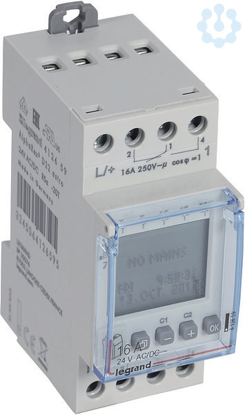 Legrand AlphaRex³ D21 astro, Astrozeitschaltuhr mit Kombifunktion, 2 Kanal, 56 Schaltprogramme (28 pro Kanal), Betriebsspannung 24 V 50/60 Hz und DC, Astrofunktion (Sonnenunter/-aufgänge) kombinierbar mit Wochenzeitschaltuhrfunktion. Steuerung direkt aus der Verteilung, kein separater Lichtfänger notwendig. Programmerstellung direkt am Gerät oder mit PC, AlphaSoft, PC-Adapter(412873) und Datenschlüssel(412872). Dauer EIN/AUS, Ferienprogramm, Zufallsprogramm, 1 Std.-Test, PIN-Code Sperre, Betriebsstundenzähler, Hintergrundbeleuchtung, automatische Sommer-/Winterzeitumstellung, 5 Jahre Gangreserve, Ganggenauigkeit +/- 0,1 Sek/Tag, Kürzeste Schaltzeit: 1 Sek., Nulldurchgangsschaltung. Schaltausgang: 1 Wechsler.