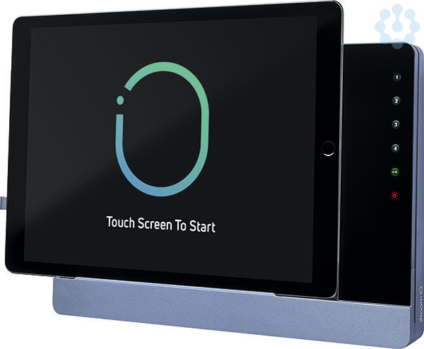 Aufputz Dockingstation mit Ladefunktion, iPad-Verriegelung und Steuerungsfunktionalität, Gehäuse blau, Glas schwarz, Lightning Anschluss, inklusive POE+ Injektor, Audio Ausgang, USB-A Ausgang, kompatibel zu vielen Tablets durch schiebbaren Ladestecker