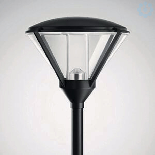 Dekorative LED-Kegelleuchte für Mastaufsatzmontage. Mit intelligentem Label zum schnellen Aufrufen von Leuchten-Informationen mittels QR-Code. Mit Leistungsreduzierung über Steuerphase. Das Abschalten einer Steuerphase bewirkt eine Einstellung des Leuchtenlichtstroms auf 50 %. Für Mastzopf Ø 76 mm. Mittels separat zu bestellender Reduzierstücke auch zur Montage an Masten mit Zopf Ø 60 mm geeignet. Passender Mast auf Anfrage. Optisches System in Multi-Lens-Technologie (MLT) ausgeführt. Leuchtenoptik bestehend aus hocheffizienten, UV- und temperaturbeständigen Linsensystemen. Mit asymmetrisch breit strahlender Lichtstärkeverteilung. Der nachträgliche Einbau einer rückseitigen / seitlichen Abschirmung ist als separat zu bestellendes Zubehör möglich. LED-System bestehend aus 3 LED-Modulen. Bemessungslichtstrom 2600 lm, Bemessungsleistung 26,00 W, maximale Leuchten-Lichtausbeute 100 lm/W. Lichtfarbe warmweiß, ähnlichste Farbtemperatur (CCT) 3000 K, allgemeiner Farbwiedergabeindex (CRI) Ra > 70. Farborttoleranz (initial MacAdam) ≤ 5 SDCM. Weitere LED-Lichtfarben auf Anfrage verfügbar. Mittlere Bemessungslebensdauer LCLO(tq 25 °C) = 100.000 h. Die Lichtquelle ist entsprechend der Ökodesign-Anforderungen (VO (EU) 2019/2020) austauschbar. Ausführungen mit 3-Stufen-Schalter zur Einstellung unterschiedlicher Lichtströme auf Anfrage. Leuchtenkörper aus Aluminium-Druckguss, Leuchtendach aus korrosionsbeständigem Aluminium, hochwetterfest pulverbeschichtet. Farbe schwarz (RAL 9005). Seewetter geeignete Beschichtung auf Anfrage. Leuchtendach innen weiß pulverbeschichtet. Abschlusszylinder aus hochschlagzähem PMMA, klar. Schutzklasse (EN 61140): II, Schutzart (DIN EN 60529): IP23, Schutzart Lampenraum: IP65, Stoßfestigkeitsgrad nach IEC 62262: IK04. Mast auf Anfrage erhältlich. Windangriffsfläche fw 0,360 m2. Gewicht: 11,5 kg. Mit elektronischem Betriebsgerät, schaltbar. Parametrierbares Betriebsgerät mit Lichtstromkonstanthaltung (CLO). Das Betriebsgerät ist entsprechend der Ökodesign-Anforderungen (VO (EU) 2019/2020) austauschbar. Mit angeschlossener, 6000 mm langer Zuleitung. Mit isoliertem Stützpunkt für den Erdleiter. Elektroblock mit allen elektrischen Komponenten werkzeuglos austauschbar. Stoßspannungsfestigkeit Differential Mode / Common Mode: 6 kV / 10 kV. Das Produkt erfüllt die grundlegenden Anforderungen der anwendbaren EU-Richtlinien und des Produktsicherheitsgesetzes und trägt die CE-Kennzeichnung. Zusätzlich ist die Leuchte durch eine unabhängige Prüfstelle ENEC-zertifiziert.