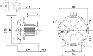 Drehstrom-Ausführung: Axial-Rohrventilator, in Drehstromausführung. Kurzbeschreibung: Rohrhülse aus verzinktem Stahlblech, beidseitig mit Flansch. 8-blättrige Flügelräder aus glasfaserverstärktem Polyamid. Flanschbohrungen gemäß DIN EN 12220:1998. DZR 56/6 B und DZR 56/4 B: Flanschbohrungen gemäß DIN EN 12220: 1998. Zur Vermeidung von Schwingungsübertragungen auf das Rohrsystem: Elastische Verbindungsstutzen, Füße und Schwingungsdämpfer verwenden. Thermischer Überlastungsschutz serienmäßig. Ventilatoren erfüllen die Anforderungen der europäischen Ökodesign Verordnung (EG) Nr.327/2011 Richtlinie 2009/125/EG. Vibrationsfreier Lauf durch dynamisch gewuchtetes Flügelrad und Motor (Welle-Rotor), gemäß Gütestufe 6.3, DIN ISO 1940, Teil 1. Hoher lüftungsseitiger Wirkungsgrad, niedriges Betriebsgeräusch. Erhöhte Langlebigkeit durch qualitativ hochwertige Materialien wie geräuscharme Kugellager. Ventilatoren sind wartungsfrei. Reversierbarer Betrieb der Ventilatoren möglich. Kundenspezifische Sonderspannungen als Sonderausführungen auf Anfrage und gegen Mehrpreis lieferbar. Einbau in jeder Lage möglich. Förderrichtung: Die Förderrichtung ist gekennzeichnet. Standard Abluftbetrieb, Förderrichtung über Motor saugend. Drehstrommotor: Asynchronmotor. Nicht zur Förderung wasserdampfgesättigter Luft geeignet. Bemessungsspannung 400 V, 50 Hz. Hohe Schutzart IP 55. Ausnahme EZR/DZR ... D IP 54. Drehzahlsteuerbar. Ausnahme bei Typ DZR 40/2 B. Geräte lassen sich mit einem optionalen 5-Stufentransformator stufenweise schalten. Reversierbar. Reversierbetrieb: Der Volumenstrom verringert sich um ca. 35 % bei anomaler Förderrichtung. Thermischer Überlastungsschutz serienmäßig. Ausnahme bei Typ DZR 25/4 D und polumschaltbaren Axial-Rohrventilatoren auf Anfrage erhältlich. Die Anschlüsse sind potenzialfrei auf Klemmen geführt und müssen an einen Motorvollschutzschalter z.B. MV 25 oder den Steuerstromkreis eines Schützes angeschlossen werden. Polumschaltbare Ventilatoren: Überlastungsschutz mit bauseitig zu beschaffendem Motorvollschutzschalter gewährleisten. Elektrischer Anschluss: Außenliegender Klemmenkasten mit Kabeltüllen. Sicherheitshinweise: Der Ventilator darf nur in Betrieb genommen werden, wenn der Berührungsschutz des Laufrades gemäß DIN EN ISO 13857 gewährleistet ist z.B. mit Maico Schutzgitter SG.Artikel: DZR 40/42 B, Fördervolumen: 4550 m3/h / 9140 m3/h, FördervolumenNenn: 3190 m3/h / 6580 m3/h / im opt. Wirkungsgrad, Druck pfs, Nenn: 90 Pa - 350 Pa - im opt. Wirkungsgrad, Drehzahl nNenn: 1480 1/min - 2920 1/min - im opt. Wirkungsgrad, Drehzahl: 1487 1/min / 2948 1/min, Laufradtyp: axial, Drehzahlsteuerbar: ja, Reversierbarkeit: ja, Spannungsart: Drehstrom, Bemessungsspannung: 400 V, Netzfrequenz: 50 Hz, Nennleistung: 240 W / 1610 W / im opt. Wirkungsgrad, INenn: 0,8 A / 2,7 A / im opt. Wirkungsgrad, IMax: 4 A, Schutzart: IP 55, Wärmeklasse: F, Polumschaltbar: ja, Polanzahl bei hoher Drehzahl: 2, Polanzahl bei niedriger Drehzahl: 4, Netzzuleitung: 5 / 1,5 mm2, Einbaulage: waagerecht / senkrecht, Material: Stahlblech, verzinkt, Farbe: silber, Gewicht: 22,97 kg, Gewicht mit Verpackung: 25,07 kg, Nennweite: 400 mm, Breite: 438 mm, Höhe: 438 mm, Tiefe: 370 mm, Breite mit Verpackung: 515 mm, Höhe mit Verpackung: 495 mm, Tiefe mit Verpackung: 400 mm, Fördermitteltemperatur bei Nennstrom: 60 °C, Fördermitteltemperatur bei IMax: 60 °C, Gesamteffizienz e: 58,3 %, Messkategorie: D, Effizienzkategorie: total, Effizienzgrad N: 63,7, VSD erforderlich: nein, Herstellungsjahr: siehe Typenschild, Herstellername / Amtliche Registriernummer / Niederlassungsort des Herstellers: Maico Elektroapparate-Fabrik GmbH / Registergericht Freiburg, HRB 601233 / Villingen-Schwenningen, PBEP / FördervolumenBEP / Pfs, BEP: 0,24 kW / 1,61 kW / 7900 m3/h, nBEP: 2930 1/min, spezifisches Verhältnis: ca. 1, Informationen zur Zerlegung und Entsorgung: siehe Montageanleitung, Informationen zu Einbau, Betrieb und Instandhaltung: siehe Montageanleitung, Verwendete Gegenstände bei der Effizienz-Messung, die nicht durch die Messkategorie beschrieben sind: -, pf, BEP: 380 Pa, SchallleistungspegelLWA5: 76 dB(A) / 93 dB(A), Gleichstrommotor: false