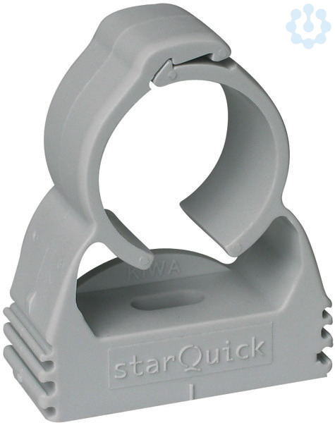 Walraven Rohrschelle starQuick aus grauem (RAL 7035) Polyamid (PA6) schließt, wenn das 40- bis 44-Millimeter-Rohr eingedrückt wird, UV-, alterungs-, öl- und benzinbeständig, korrosions-, halobgenfrei, recyclebar, temperaturbeständig -75 bis +90 Grad.