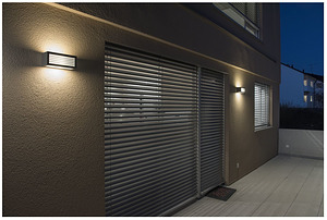 Einflammige LED Wandleuchte BOX-L bestehend aus lackiertem Aluminium und satiniertem Acryl welches die drei Lichtauslässe abdeckt. Durch Schutzart IP44 für den Außenbereich geeignet. Der elektrische Anschluss der in mehreren Farbversionen verfügbaren Leuchte erfolgt direkt an 230V Netzspannung.
