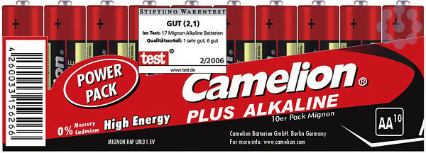 Die Camelion Plus Alkaline Batterien liefern einen hohen Strom, damit der Verbraucher sich durch den Einsatz in Fernbedienungen, Spielzeugen, Radios und anderen vielfältigen Geräten im Vergleich zu Zink-Kohle Batterien länger erfreuen kann. Mit ihrer langlebigen Energie und ausgezeichneten Lagerfähigkeit ist sie ideal für die meisten elektronischen Anwendungen.