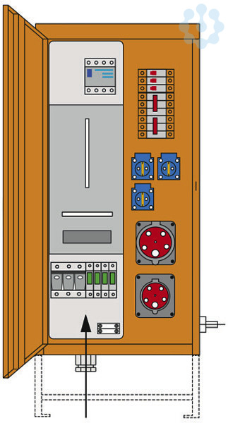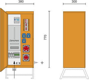Versorgungsgebiet: OÖ (eingeschränkt) , Salzburg, Wien, Vorarlberg; Baustromverteiler 35A nach ÖVE EN 61439/4; RAL 2000 / 26kg / 380x770x300mm (BxHxT) ohne Untergestell; incl. Überspannungsableiter 3+1 (TT+TN) Kl."C" (25A - 125A); Anschlusssicherung: D02 Sicherungslasttrennschalter 35A; mit nicht auswechelbaren Passeinsätzen; Anschlussquerschnitt: max. 16mm² Cu; Zählerplatz: Wirkstromzählerschleife H07V-K 16mm2 400V AC; 1xCEE-Steckdose 32A 5p 400V abgesichert ü. 1xLS 32A 3p C; 1xCEE-Steckdose 16A 5p 400V abgesichert ü. 1xLS 16A 3p C; 3xSK-Steckdose 16A 250V IP54 abgesichert ü. 3xLS 16A 1p C; 1xFI 40A/4/0.03A therm. fest über alle Ausgänge