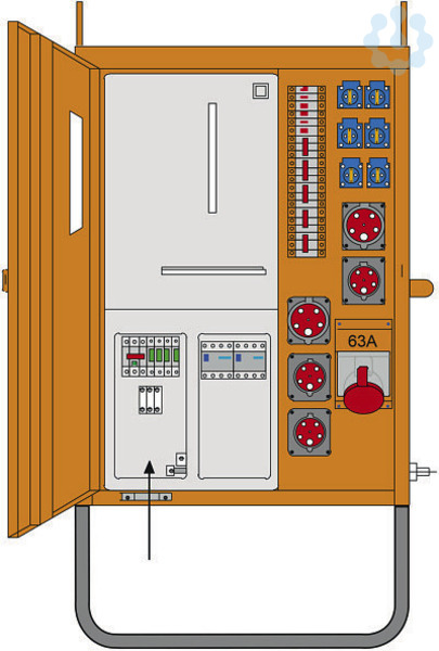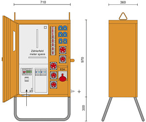 Versorgungsgebiet: TIWAG; Baustromverteiler 50A nach ÖVE EN 61439/4; RAL 2000 / 65kg / 710x1270x360mm (BxHxT) m. Untergestell 300mm; incl. Überspannungsableiter 3+1 (TT+TN) Kl."C" (25A - 125A); Anschlussklemmen 6-35 mm² Cu; Zählerplatz: Wirkstromzählerschleife H07V-K 16mm2 400V AC; Hauptsich.: Tarifschalter 40–50A 3p ü alle Ausg. im Vorzählerbereich plombierbar; 1xCEE-Steckdose 63A 5p 400V ü. FI direkt ab Tarifschalter; 2xCEE-Steckdose 32A 5p 400V abgesichert ü. 2xLS 32A 3p C; 3xCEE-Steckdose 16A 5p 400V abgesichert ü. 3xLS 16A 3p C; 6xSK-Steckdose 16A 250V IP54 abgesichert ü. 6xLS 16A 1p C; 1xFI 100A/4/0.3A Umrichterfester FI für CEE-Steckdose 63A 5p 400V; 1xFI 63A/4/0.03A therm. fest für die restlichen Steckdosen