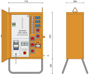 Versorgungsgebiet: OÖ, Salzburg; Baustromverteiler 63A nach ÖVE EN 61439/4; RAL 2000 / 70kg / 710x1270x360mm (BxHxT) m. Untergest. 300mm; incl. Überspannungsableiter 3+1 (TT+TN) Kl."C" (25A - 125A); Anschlusssicherung: NH-Trenner Gr.00 80A; Anschlussquerschnitt: max. 35 mm² Cu; Zählerplatz: Wirkstromzählerschleife H07V-K 25mm2 400V AC; Haupsicherung: Lasttrennschalter mit Sicherung DIII 63A; 1xCEE-Steckdose 63A 5p 400V keine Strompfadsicherung; 2xCEE-Steckdose 32A 5p 400V abgesichert ü. 2xLS 32A 3p C; 3xCEE-Steckdose 16A 5p 400V abgesichert ü. 3xLS 16A 3p C; 6xSK-Steckdose 16A 250V IP54 abgesichert ü. 6xLS 16A 1p C; 1xFI 100A/4/0.3A Umrichterfester FI für CEE-Steckdose 63A 5p 400V; 1xFI 63A/4/0.03A therm. fest für die restlichen Steckdosen